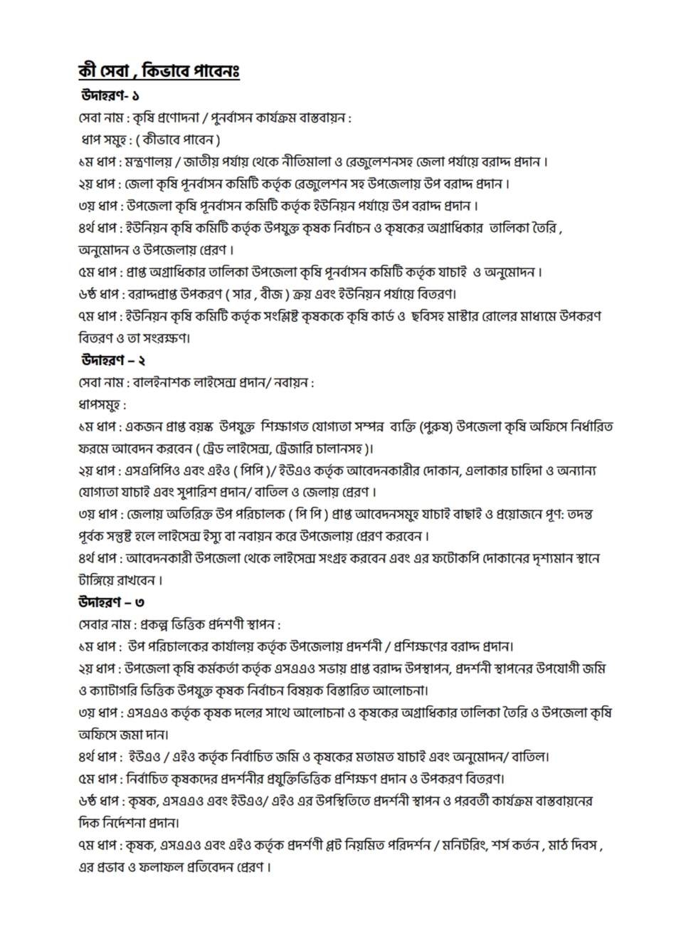 | কৃষিতে ভর্তুকি ও উৎপাদনে সহায়তা প্রদান | ১| উপজেলা কৃষি কর্মকর্তা ২| অতিরিক্ত কৃষি কর্মকর্তা ৩। কৃষি সম্প্রসারণ কর্মকর্তা ৪। সহকারী কৃষি সম্প্রসারণ কর্মকর্তা ৫। SAAO | কৃষি উৎপাদন বৃদ্ধির লক্ষ্যে উপকরণাদি কৃষকের ক্রয় ক্ষমতার মধ্যে রাখার জন্য এবং উৎপাদন খরচ কমানোর জন্য বিভিন্ন সময় সরকারের দেয়া ভর্তুকি উপকরণাদি কৃষকদের মধ্যে বিতরণ। | প্রয়োজন মোতাবেক । | - |